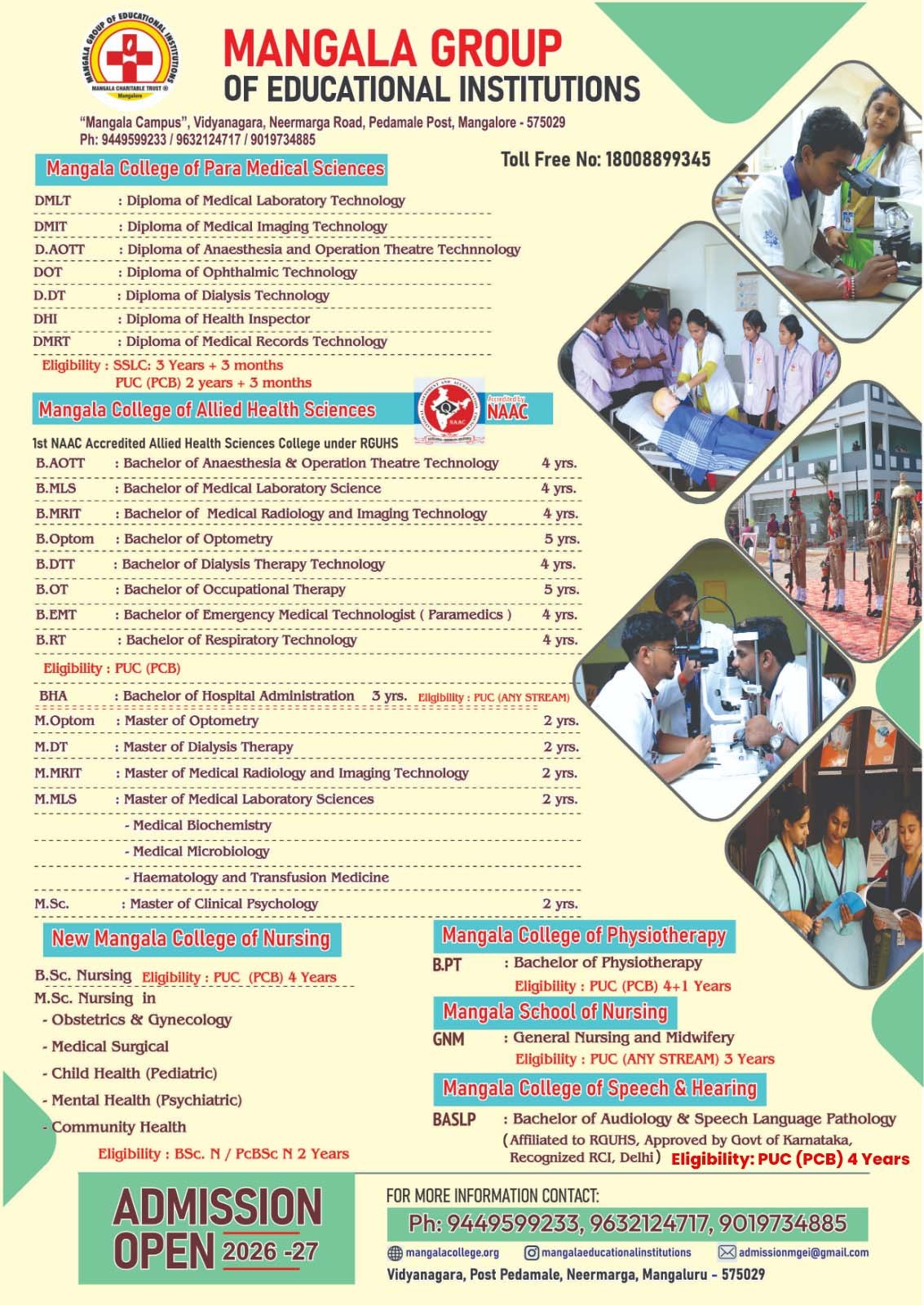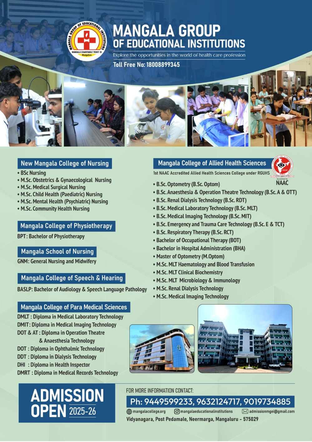 Mangala college of speech and hearing is located in Mangala college campus at Paldane,Mangalore. It is being run by the Mangala trust. It has all the amenities that are required according to RCI standards .The audiology and speech rooms are designed keeping in mind all the specifications. The department is equipped with audiological as well as speech testing instruments , classrooms which can accomodate upto 50 students. The teaching faculty are highly qualified and experienced in the field of speech and hearing.